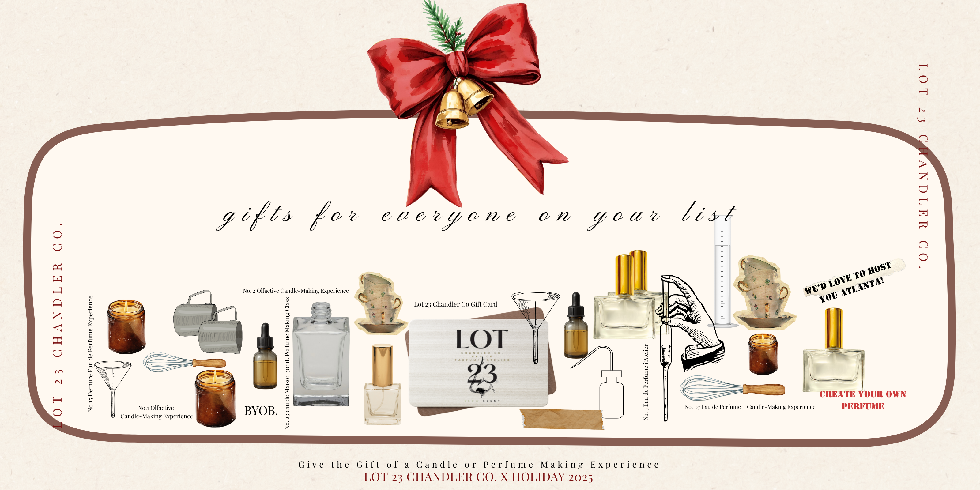 Give the gift of scent, memory, and artistry. A Lot 23 Chandler Co. gift card is an invitation to create—whether blending a custom perfume, pouring a candle, or choosing from our signature fragrance line. Available in flexible amounts, redeemable online or in-studio, it’s the perfect way to share an unforgettable olfactive experience.